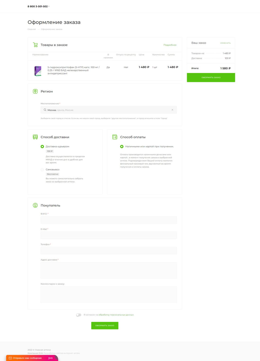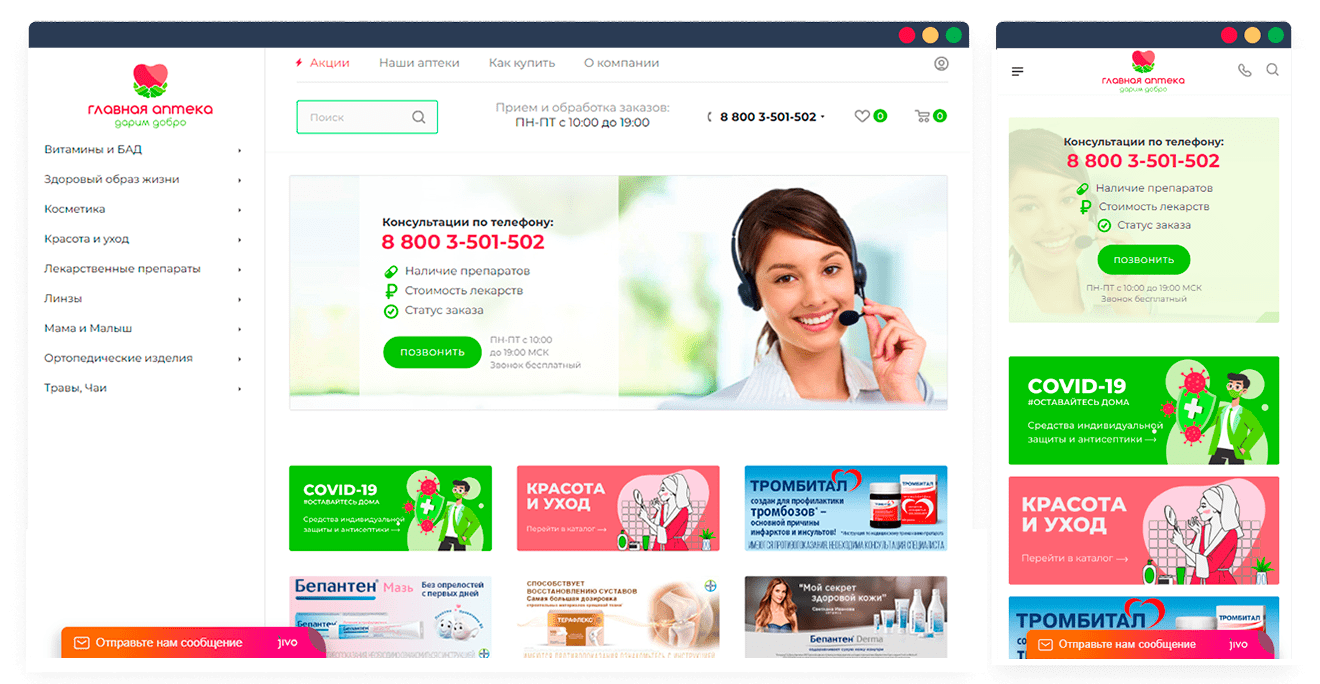У компании раньше не было своего сайта, поэтому продажа велась только через стационарную аптечную сеть. Заказчик принял решение расширить географию продаж и аудиторию клиентов, создать представительство аптеки в сети интернет. В наши задачи входило создать сайт, наполнить каталог товарами из 1С и тщательно проработать оформление, соединить склады аптек с онлайн складами.